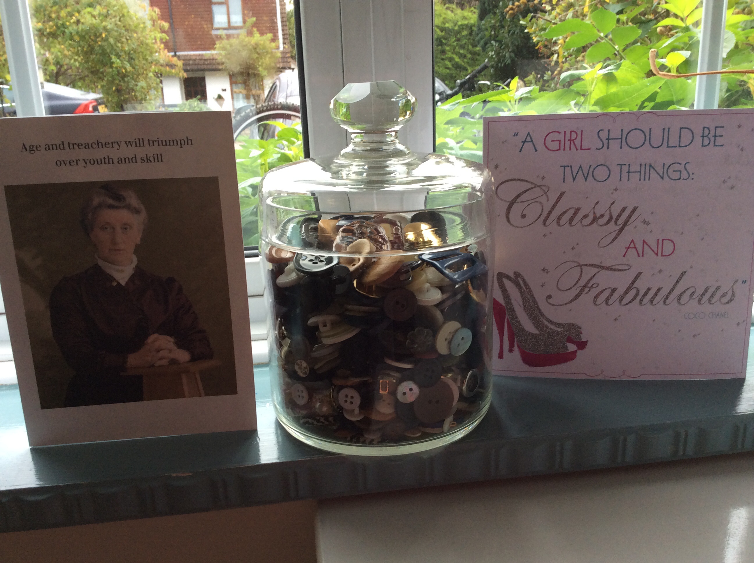 It’s rather odd to be packing the car up for a week in the Peaks: mountain bike – tick; walking boots – tick; sewing machine – TICK! It’s been a good week on the sewing front. I celebrated my birthday and a lovely sewing friend gave me a jar of buttons, a pair of stork scissors and a vintage apron.