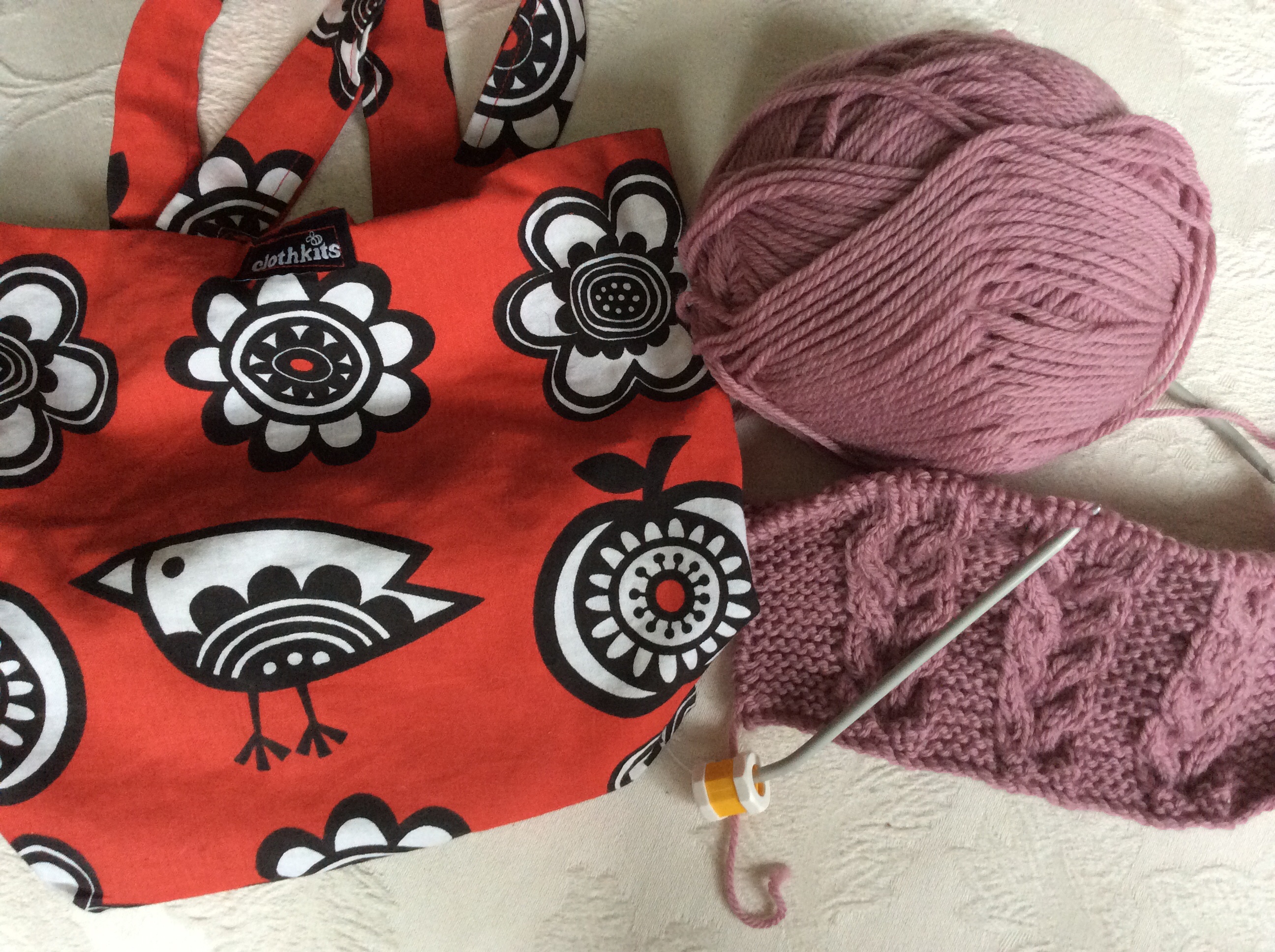I tend to knit every day on the tube and train into work. I keep my WIP in this little bag I made during my first workshop at a Clothkits – I have had some odd looks when I open my Mulberry and pull out my knitting. I am currently working on a variety of squares to make a blanket for my daughter.