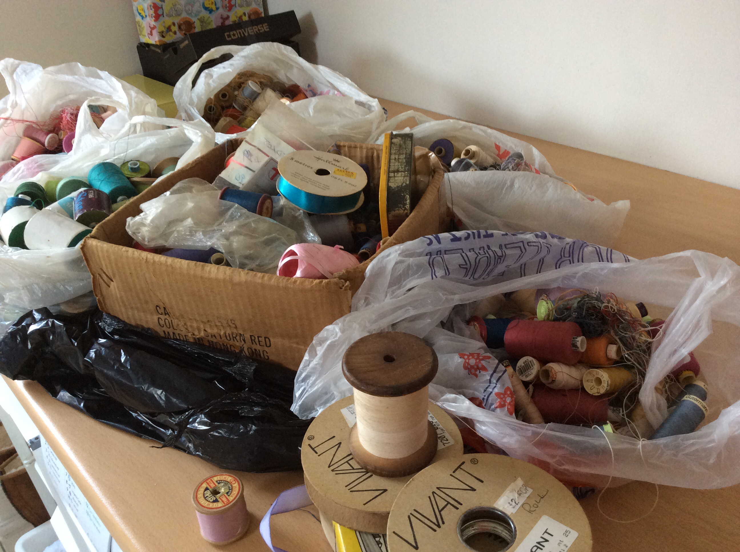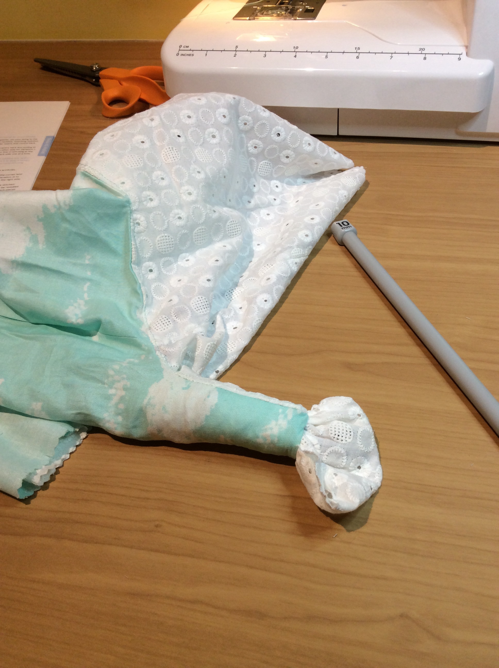 I promise I won’t do this again. I have now had a private lesson and been shown how to change my threads – although I haven’t yet done it by myself. If you look very carefully at the picture of the bodice you can see just see the darkness of the thread peeping through – Oh I am a wally. Luckily it’s on the inside so only I know. The bodice top was a challenge for me – I have never done that thread the fabric through the shoulders thing before – I didn’t think it would ever go through and when it did, the fabric was so creased it looked like a rag. Here is a picture mid procedure – looks rude doesn’t it?