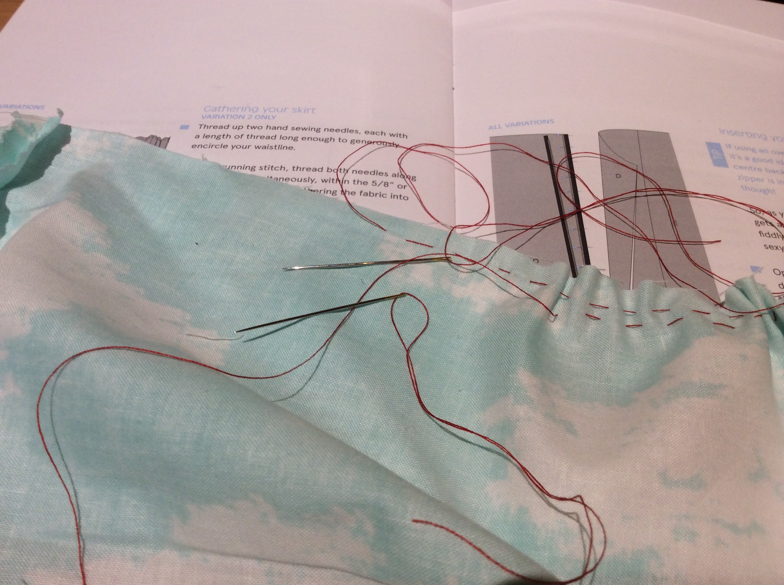 I also learned a new technique for gathering and I have to say, it has produced the best results so far; you prepare the gathers by hand-sewing two rows of running stitch at the same time.