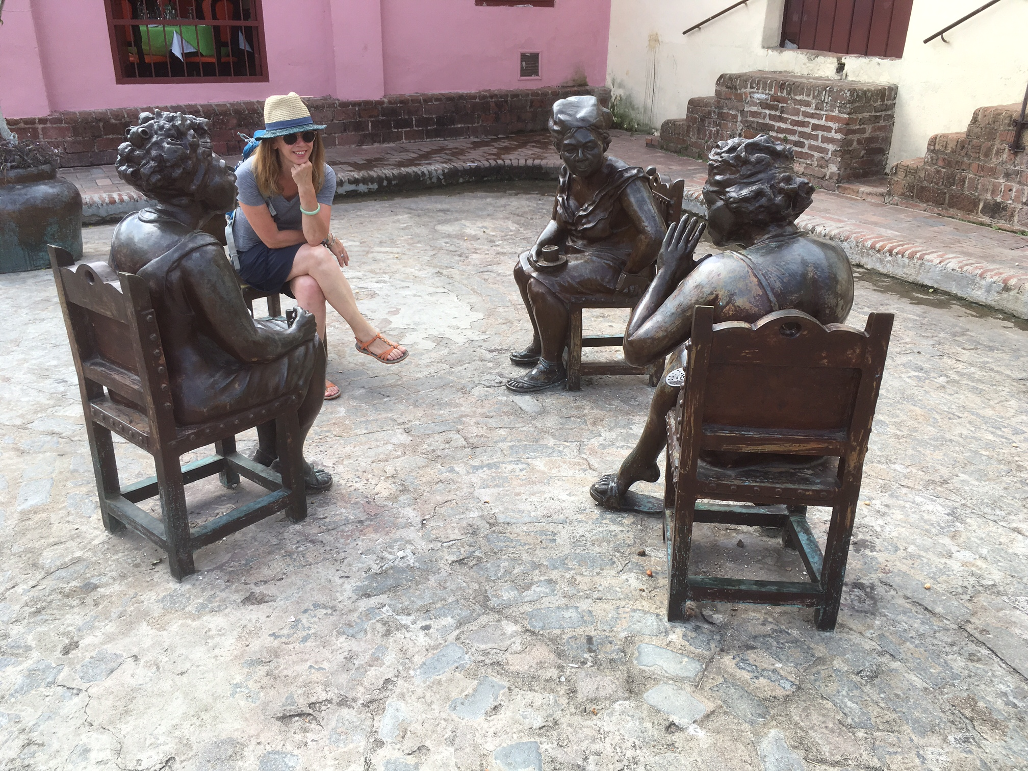 We visited Camaguey and I was delighted to encounter this astonishing sculpture of women gossiping in one of the town squares. As I sat down on the empty chair to join in, I realised that one of the women was a seamstress! I discovered that this sculpture (and others in the square) were the work of a contemporary Cuban artist who has her gallery in the city; the models for the sculpture are all local residents.