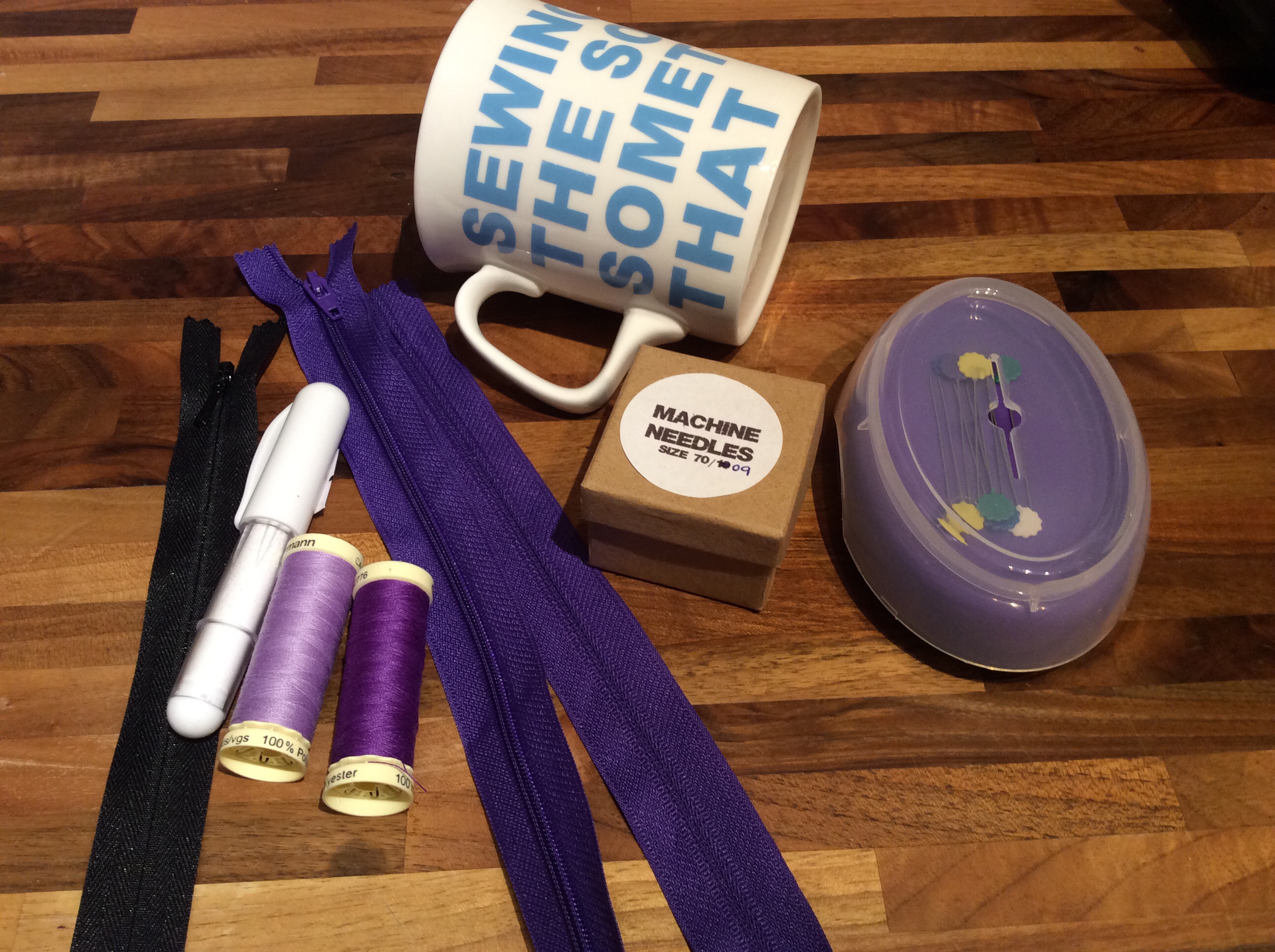 It was a really productive couple of hours; we had a cup of tea and a chat and Katya took me through the whole of the manual – I changed the threads – twice; learned how to lower the knife; use a gathering attachment; do a rolled hem etc. etc. It remains to be seen if I will be able to do these thing by myself but I certainly feel more confident about having a go – thank you Katya. I would certainly recommend having a private lesson to anyone who has the equivalent of Writer’s Block with any aspect of sewing! Tomorrow I am off to another workshop – as you know I am a bit of a workshop junkie and I am going to a new studio for me in South London – Badger and Earl. I am going to be doing a class with Handmade Jane making the Mortmain dress. The feature of this dress is its exposed zip. I bought this glorious fabric at Sew Over It and a purple zip but I really wasn’t sure if I actually liked the exposed zip idea anyway. But …. Look … my lovely friend Ali offered to rummage through her vintage supply (kept in a trunk no less) and gave me this gorgeous white zip with silver teeth (?) which I think will go perfectly.